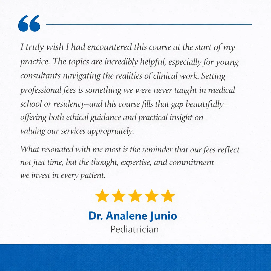 Her extensive experience in both private practice and healthcare business management makes her the perfect mentor to guide doctors in setting professional fees with confidence — so they can charge fairly, sustain their practice, and be compensated for their expertise.